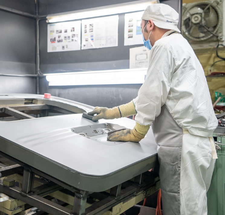 - 主にプレスをメインとした生産現場であり、軽自動車のテールゲート(バックドア)など外板部品と言われる人の目に触れる部品のプレス成形を行っています。また、人気ミニバンなどの部品の加工を行っており、活気に溢れた部署です。